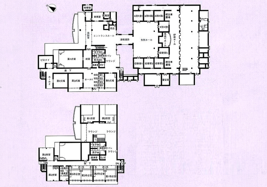• 施設:火葬炉、複数の式場、会葬者控室、遺族控室、霊安室、待合室、駐車場など